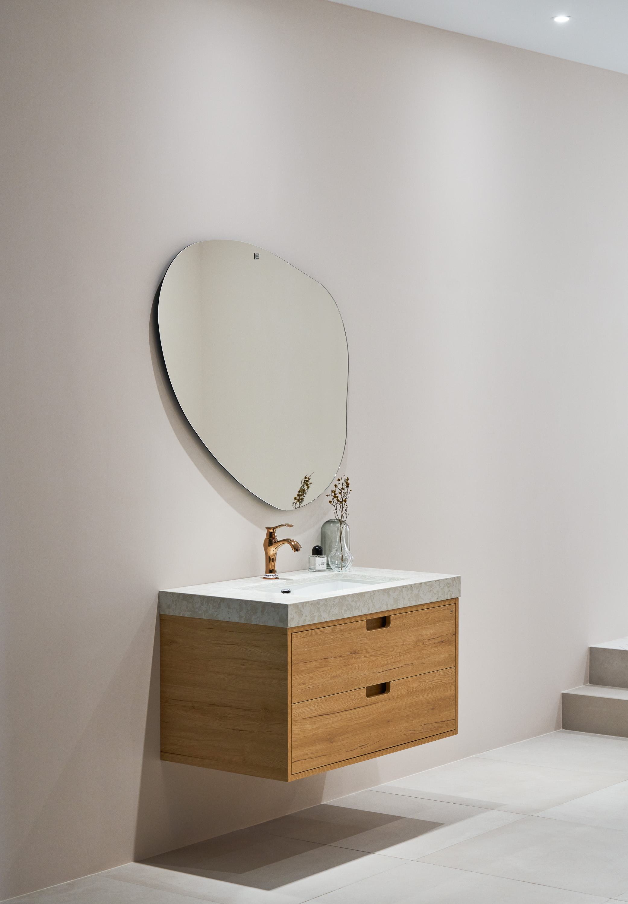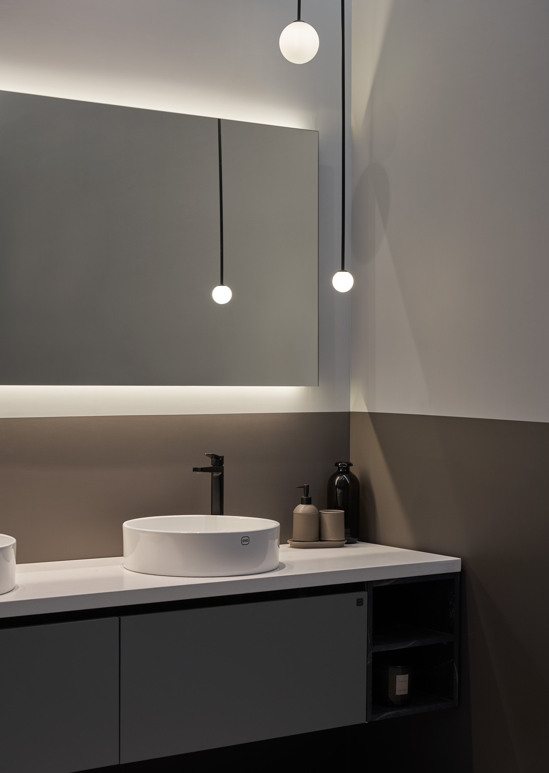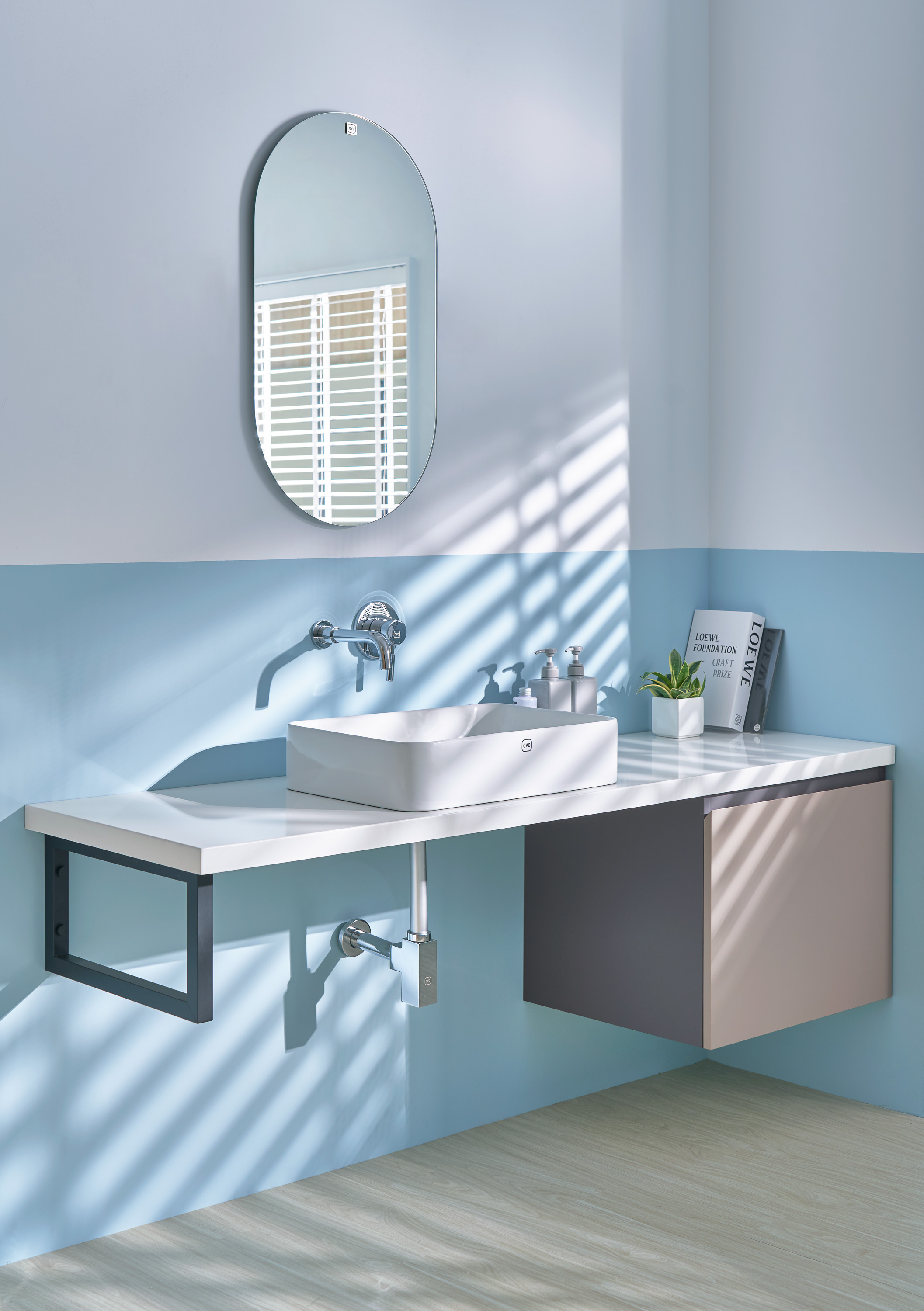 OVO京典衛浴提供多樣化的浴櫃與鏡櫃,板材為100%防潮、防水的實心發泡板,不用擔心腐爛、不耐久的清況發生;另外,也提供客製化服務,數十種色系供顧客任意選配,包含尺寸大小、開門形式、把手樣式及檯面樣式都可以量身定做,完美符合使用需求與愛好,打造獨一無二的浴室空間。