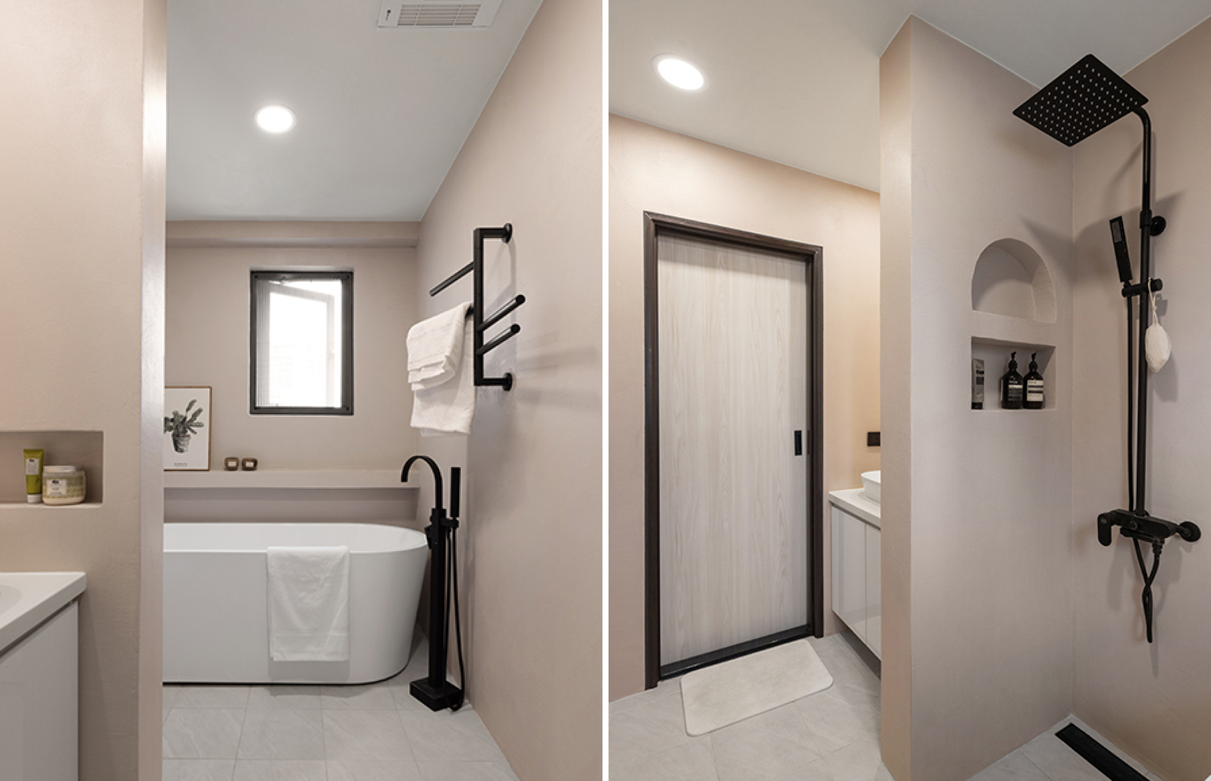 而在衛浴空間中,以 OVO 爵士黑系列讓浴室空間跳脫「淺色」框架,採用黑色單品作為點綴,牆面使用粉色微水泥塗料,觸感上更接近水泥質地,打造視覺流動感,營造輕工業風格。