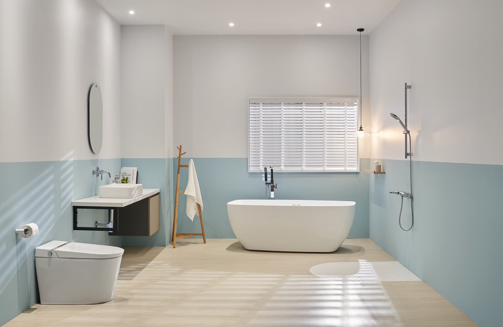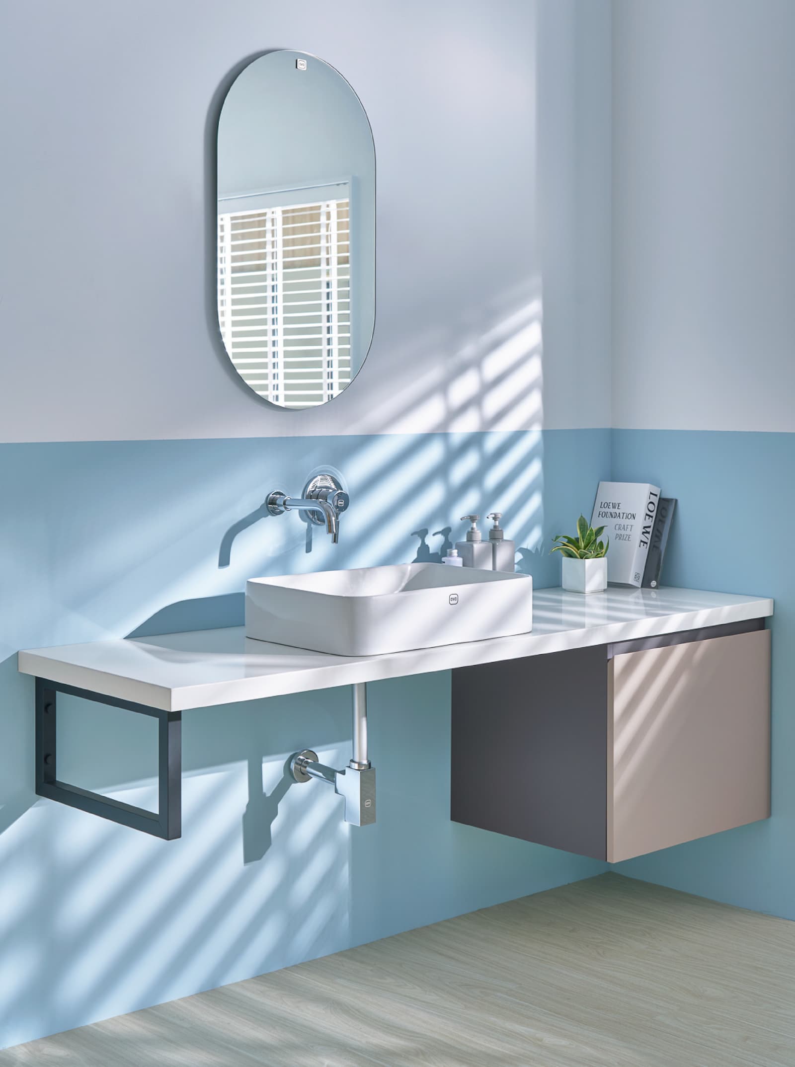 歐系的低飽和色彩讓居家時光更為舒適,運用流線型的產品設計,呈現明亮的洗漱空間。