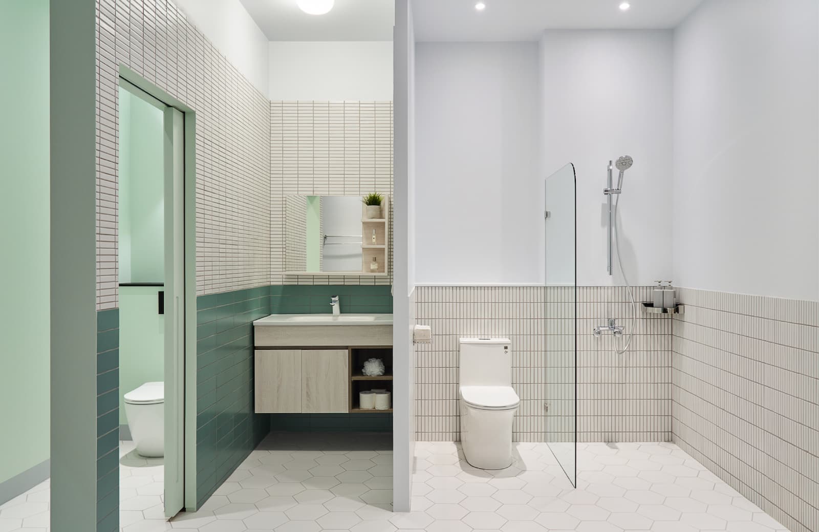 實際上,如廁的頻率遠高於沐浴頻率,1.5 套衛浴由 2 套衛浴縮減 1 個淋浴空間,或由 1 套衛浴增加馬桶而成,提高空間、設備的使用頻率,動線、結構許可之下,更可共用臉盆,使空間利用達到最高效能。