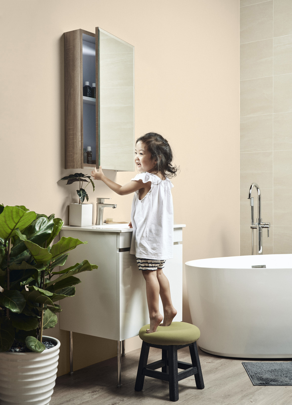 訂製單門鏡面收納櫃表面呈現京典櫸木質紋理,增添自然溫潤氛圍;滿版鏡面設計增加空間通透感,鏡櫃內適合收納常用小物,方便拿取。
