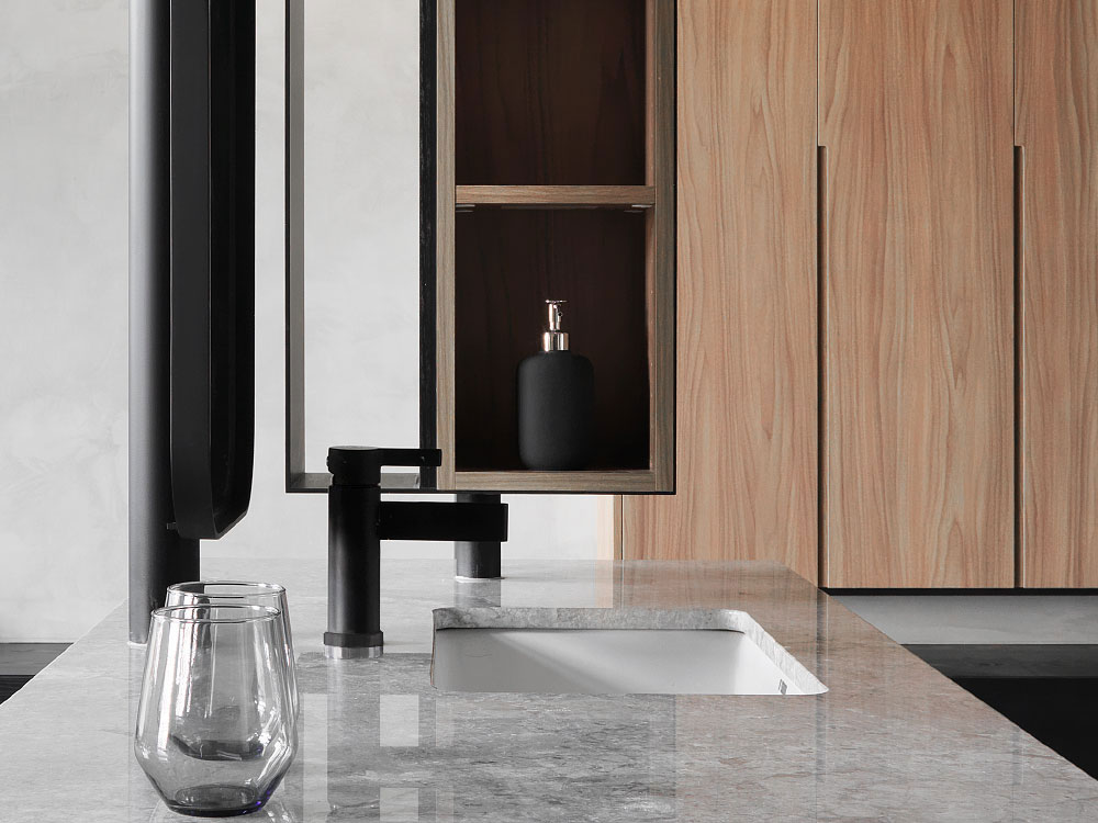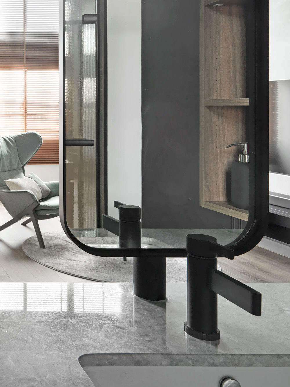 深色產品因色澤較深,在使用過程中容易因水中礦物質與皂垢的殘留,於表面形成白色水痕或水垢,視覺上較為顯眼,建議定期(1-2週)以中性 / 天然清潔劑,搭配乾淨的軟布擦拭保養。