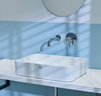 埋壁型臉盆龍頭組外型簡約,牆面出水設計更顯高級感。出水管亦可旋轉,靈活使用於不同情境。