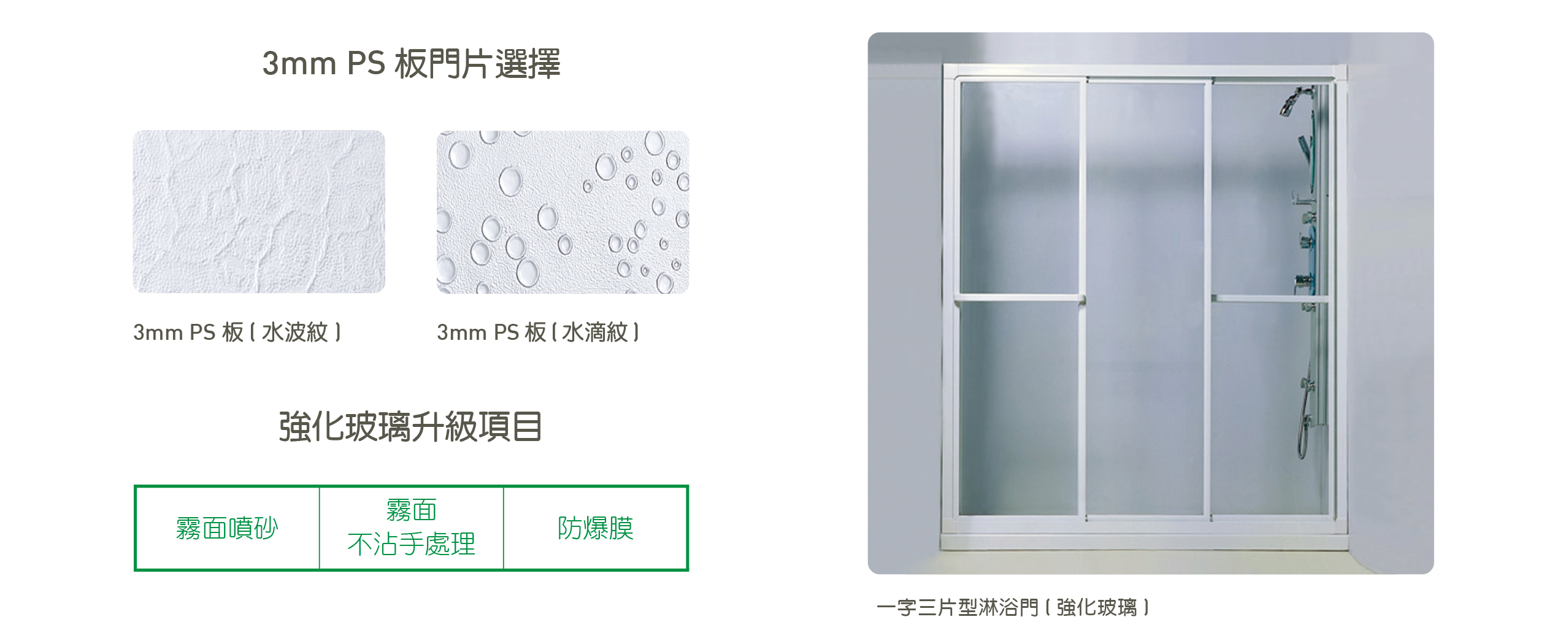 *玻璃材質:可選擇 4mm 清透強玻或 3mm PS板 ( 水滴或水波紋 )YK185 一字三片型淋浴門