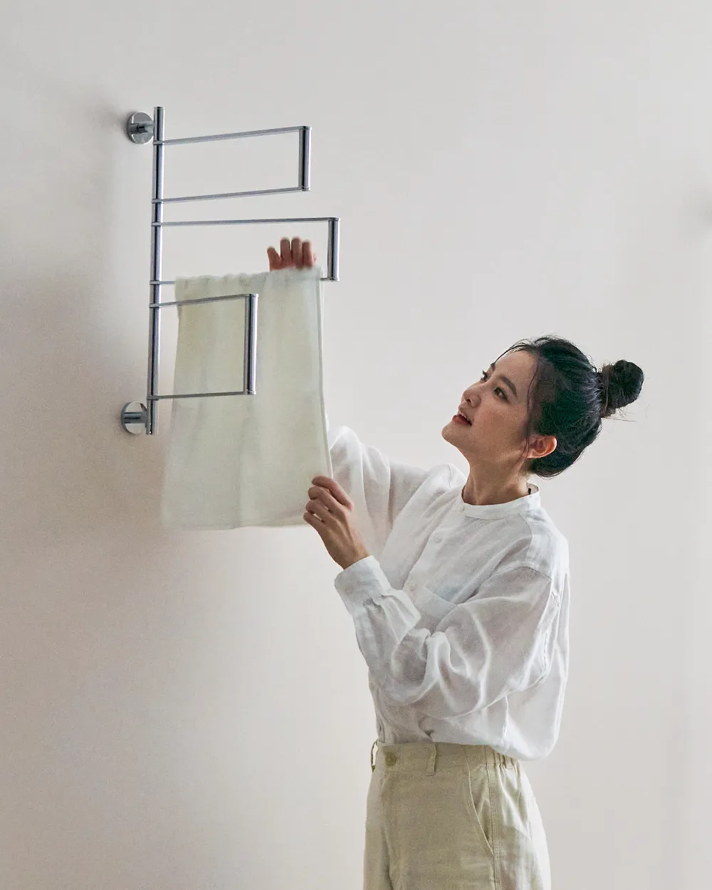 活動毛巾架可分別左右旋轉,晾曬毛巾更方便,不使用時可靠牆收納,不佔空間。