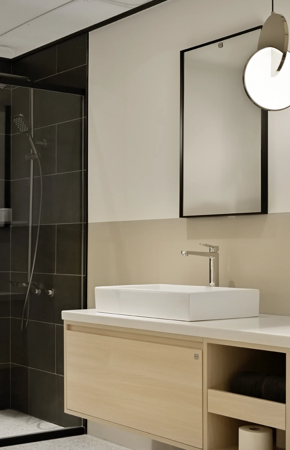 檯面式臉盆方正薄型造型,為大容水量設計,搭配加高型臉盆龍頭,營造視覺層次感。