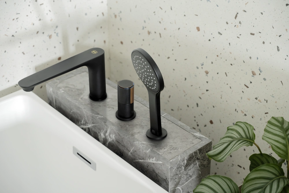 霧面黑色系浴缸龍頭三件式,龍頭主體、蓮蓬頭、開關把手皆為獨立設計,打造輕工業飯店風衛浴。