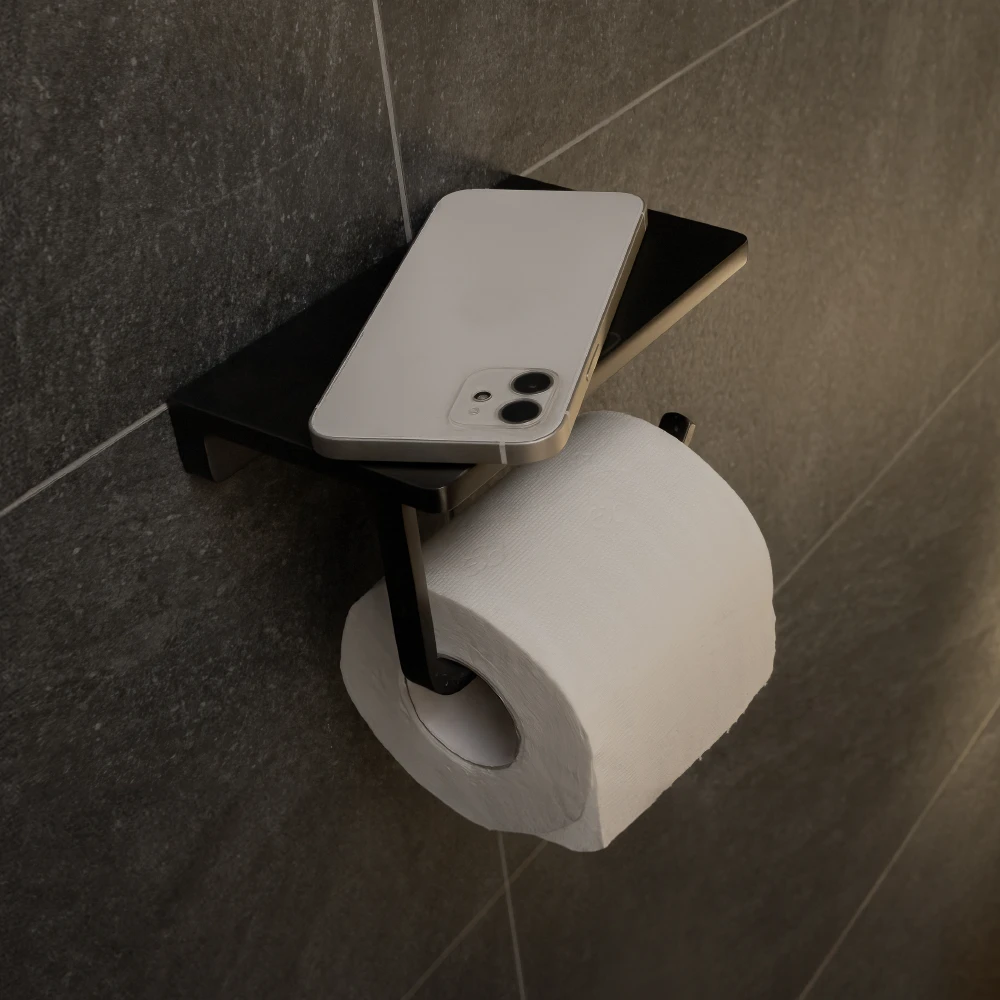 灰色霧面表層處理,為捲筒衛生紙架與置物平台多功能合一,帶來更便利的質感衛浴生活。