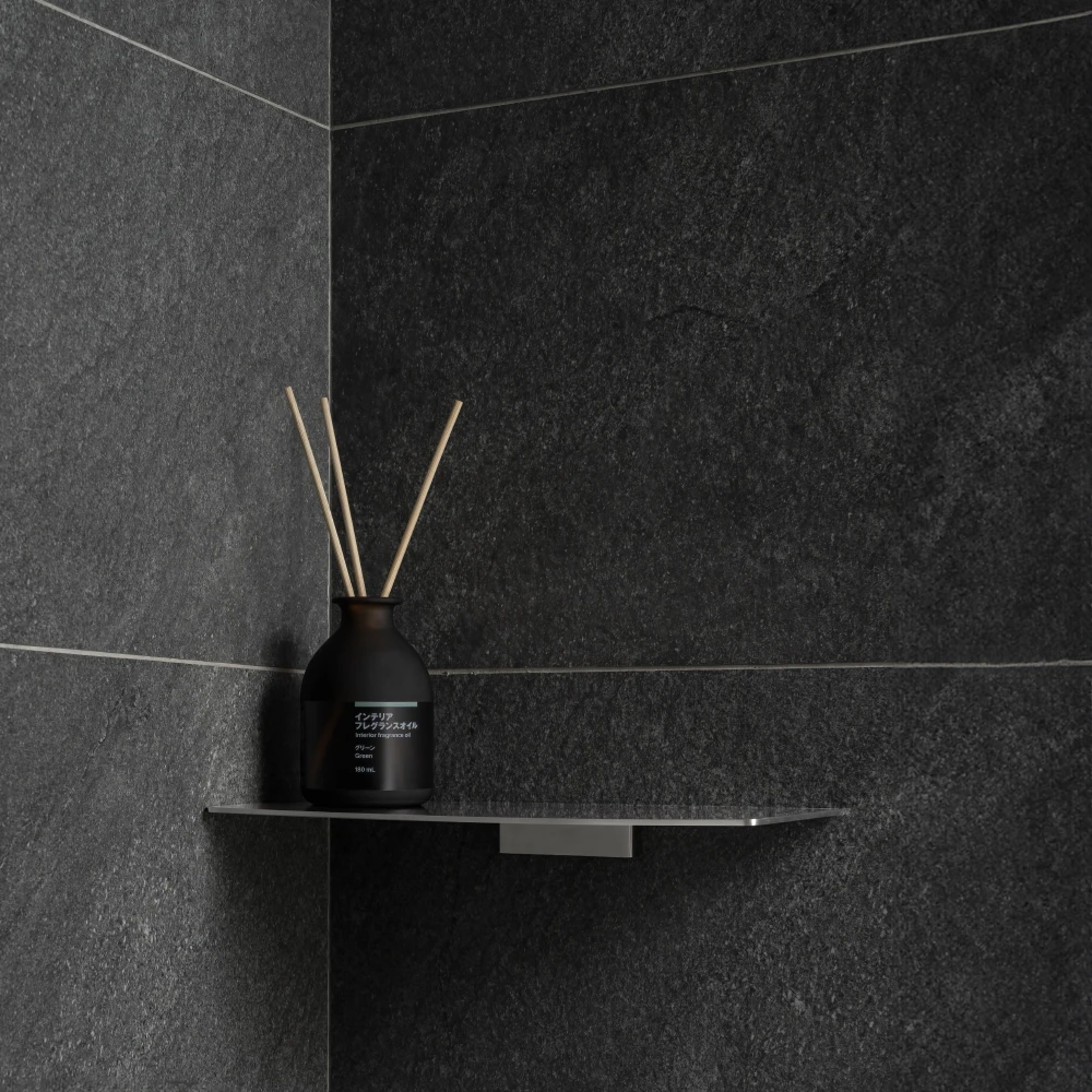 置物平台為霧面不鏽鋼材質,適合擺放衛生紙或擴香等物品,輕薄方型設計讓衛浴設計更加簡潔、俐落。