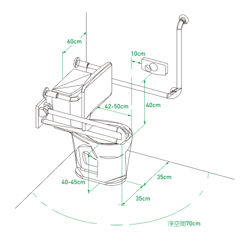 1. 馬桶至少有一側邊之淨空間不得小於 70cm,馬桶前緣淨空間不得小於 70cm。