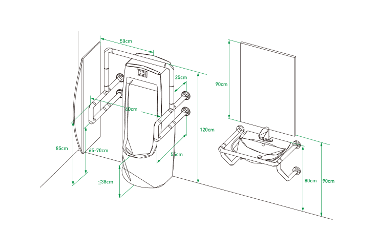 5. 無障礙小便斗兩側及前方應設置扶手。兩側扶手中心線之距離為 60cm ,深度為 55cm,扶手上緣距地板面為 85cm,扶手下緣距 地板面 65cm 至 70cm 。前方扶手上緣距地板面為 120cm,其中心線與牆壁之距離為 25cm。