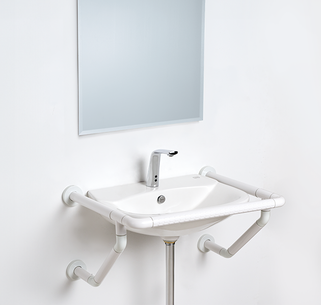 2. 臉盆兩側及前方環繞臉盆處應設置扶手,扶手應高於臉盆 1~3cm。