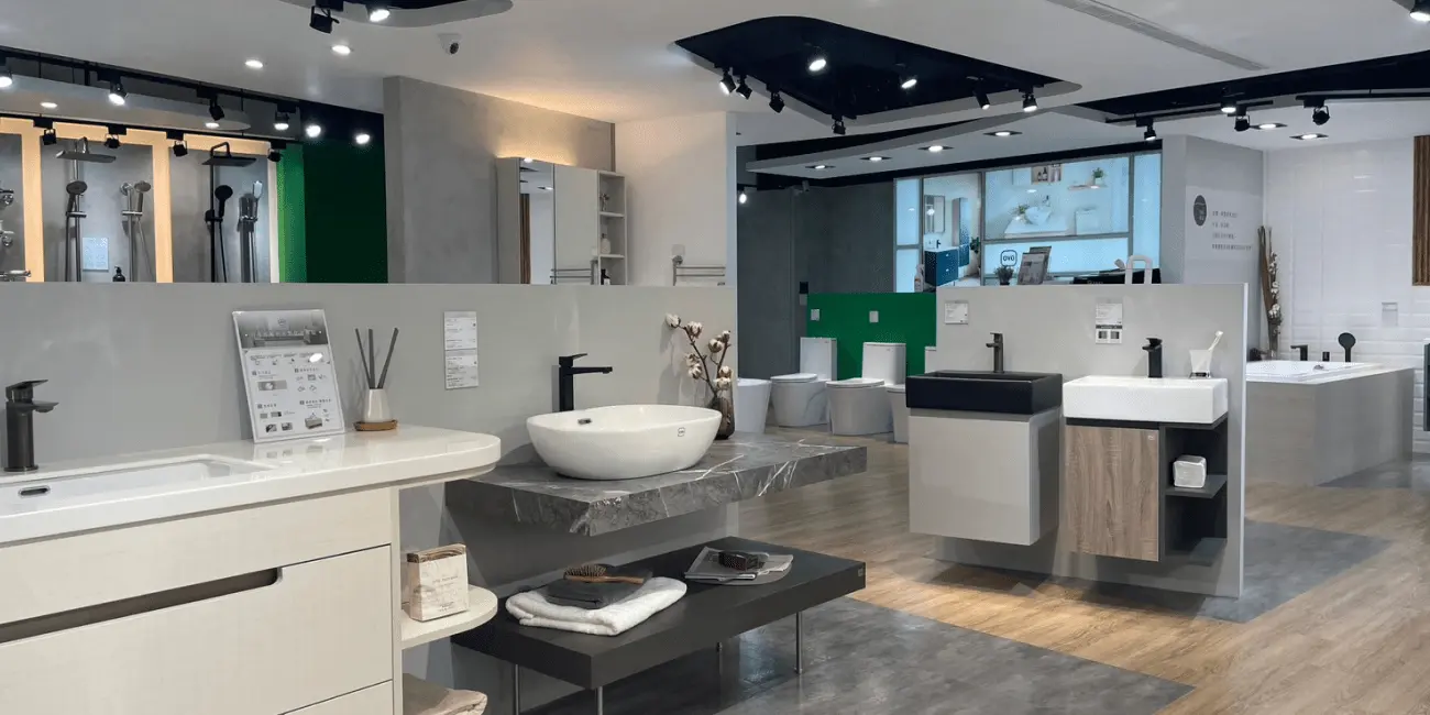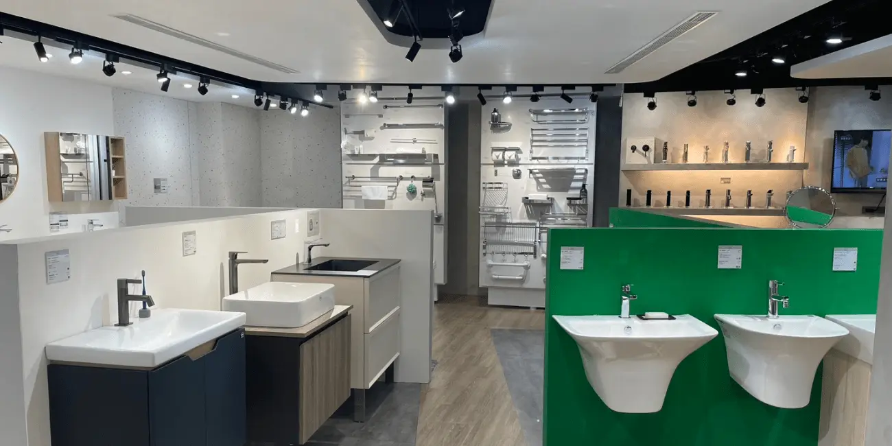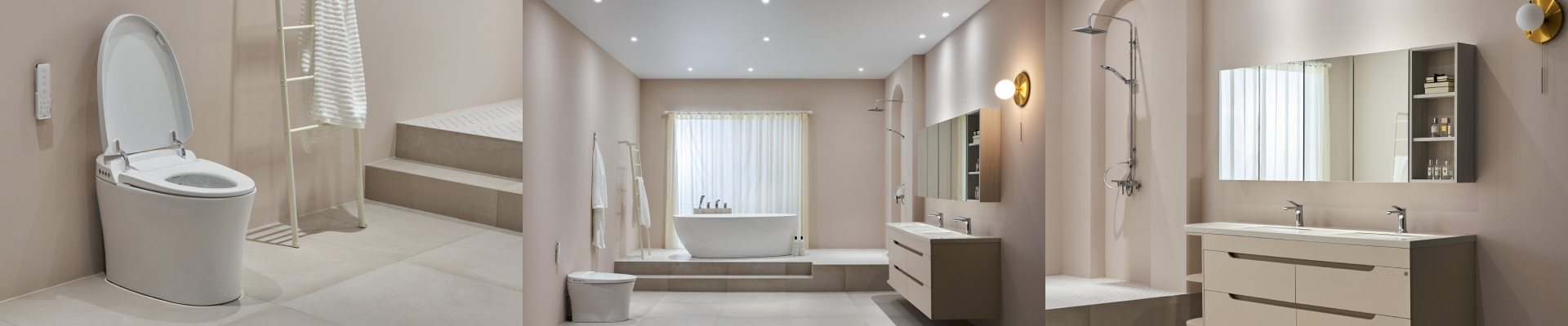 以明亮開放的空間設計,呈現多樣化的衛浴組合。從馬桶、臉盆、浴櫃到淋浴設備,展現整體衛浴的設計美學。透過材質、色系與比例的搭配,營造貼近生活的氛圍,啟發顧客對理想衛浴空間的想像。